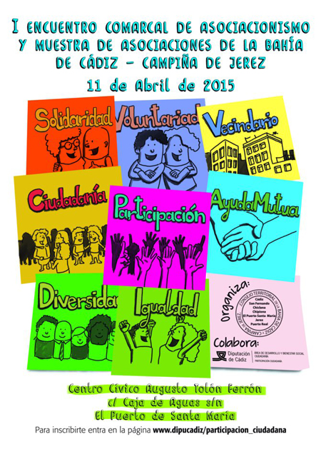El I Encuentro Comarcal de Asociacionismo y Muestra de Asociaciones de la Bahía de Cádiz y Campiña de Jerez, que organiza la Diputación a través de su servicio de Participación Ciudadana, en colaboración con el Ayuntamiento, tendrá lugar el próximo sábado 11 de abril en el Centro Cívico Augusto Tolón Ferrón, de El Puerto de Santa María. El objetivo de esta jornada es fomentar la participación ciudadana a través de un espacio de encuentro y conocimiento mutuo entra las diferentes entidades.