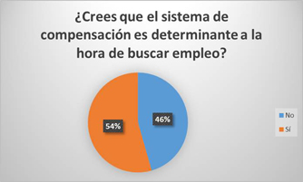 Las empresas se esmeran en atraer y retener a los colaboradores con más talento del mercado, sin embargo, no tienen en cuenta que las personas también buscan organizaciones que satisfagan sus requerimientos. Prueba de ello es que para el 54% de encuestados el sistema de compensación que ofrece la empresa es determinante a la hora de buscar empleo, mientras que para un 46%, es indiferente.