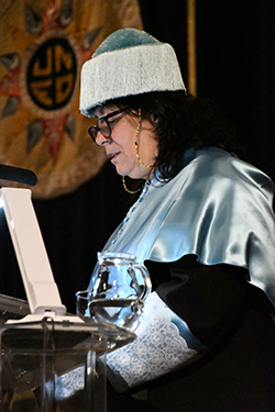 Almudena Grandes inicio su discurso agradeciendo de corazón este honor que “recibo con orgullo y compromiso, de esta gran Universidad pública española y me comprometo a defender la educación pública desde las aulas de infantil hasta los posgrados”. Tras este compromiso ha afirmado que “Toda novela es producto de una larga serie de naufragios” y tras evocar a Miguel de Cervantes meditabundo en su celda con el papel delante para escribir el prólogo de las hazañas y desventuras del Ingenioso Hidalgo Don Quijote de La Mancha y comparar el trabajo del novelista con el de otros creadores, aseguró que “La condición del novelista es la soledad. Esa es la gloria y la miseria de un oficio que sólo puede desempeñarse pasando mucho tiempo con el papel delante, la pluma en la oreja, el codo en el bufete y la mano en la mejilla. El aprendizaje más importante de todos los que debe acometer quien aspire a dedicarse a escribir novelas es la gestión de la soledad, porque los naufragios están garantizados”.