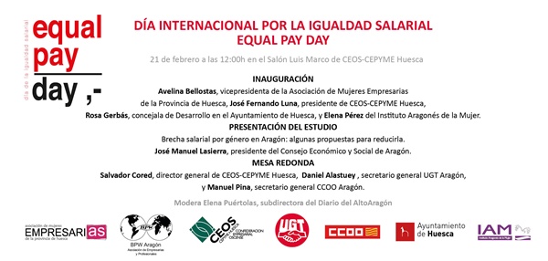 Como motivo del Día Internacional por la Igualdad Salarial, la Asociación de Mujeres Empresarias de la Provincia de Huesca (AMEPHU) organiza, con la colaboración de la Confederación Empresarial de la provincia de Huesca (CEOS-CEPYME HUESCA), UGT, CCOO, Ayuntamiento de Huesca y el Instituto Aragonés de la Mujer, una jornada el día 21 de febrero, a las 12.00 h. en el Salón de Actos de CEOS-CEPYME HUESCA, sobre la Brecha Salarial entre hombres y mujeres en Aragón.