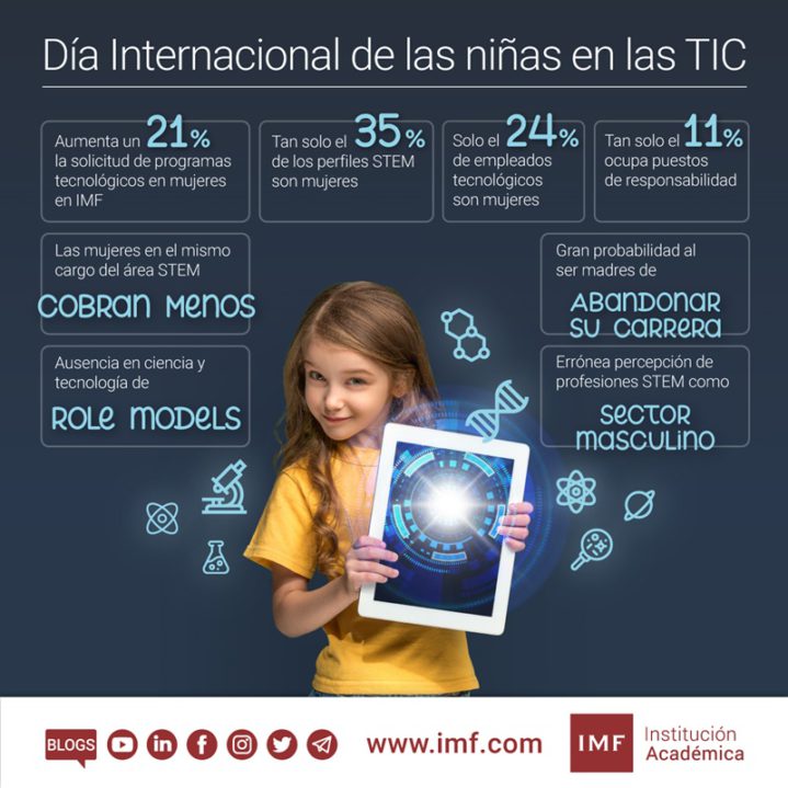 Según la American Association of University Women (AAUW) el sector del STEM se continúa percibiendo predominantemente masculino. Además, la escasez de ‘role models’ femeninos es clave: Cuando se habla de ciencia y tecnología, la inmensa mayoría de los referentes que escuchan las niñas son masculinos. “La mayoría de las mujeres, consideran que la formación en informática y todas sus variantes, son únicas y exclusivas de los hombres. Nuestros masters abren las puertas a otros sectores donde la mujer puede tener más presencia, como son: Ventas, comercio o administración. Un ejemplo es el big data, los buenos datos de matriculaciones nos permiten ver como la tecnología se puede aplicar para mejorar los resultados en cada uno de esos sectores y abrir otros ámbitos de trabajo para las mujeres.” ha asegurado Marta Ramírez, Directora Académica del área de Big Data de IMF.