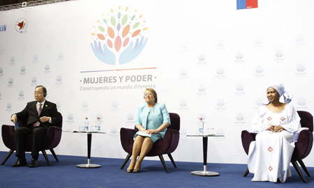 De este modo, Ban Ki-moon ha insistido en la idea de que se rompan los «techos de cristal» que impiden que las mujeres accedan a puestos de poder, tanto en las Naciones Unidas, como en los gobiernos y en el sector de los negocios: «Cuando las mujeres lideran, todos nos beneficiamos. Lo vemos aquí mismo. Bajo la presidencia de Michelle Bachelet, Chile ha avanzado iniciativas para la participación política de las mujeres».