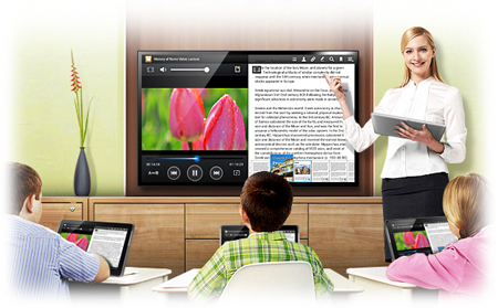 Asimismo, las aplicaciones para aulas de Samsung incorporan un Gestor de contenidos propio con el que los profesores tienen la posibilidad de insertar el horario de sus clases, colgar los temarios, y preparar ejercicios que los alumnos descargan antes de empezar cada lección. Futuras versiones del Gestor de contenidos de Samsung permitirán realizar estas funciones ya sea dentro como fuera del aula.