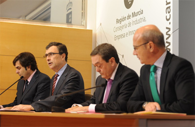 El consejero de Industria, Empresa e Innovación, José Ballesta, junto al presidente de la Confederación Regional de Organizaciones Empresariales de Murcia (Croem), José María Albarracín, y al de la Confederación Comarcal de Organizaciones Empresariales de Cartagena (Coec), Pedro Pablo Hernández, firmaron ayer un convenio para llevar a cabo una nueva edición del ‘Programa de Iniciativas Emprendedoras de la Región de Murcia’.