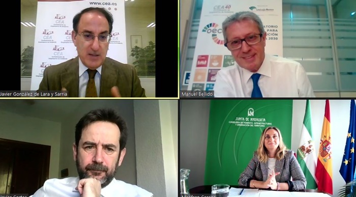 En este encuentro virtual han participado el presidente de CEA, Javier González de Lara; la consejera de Fomento, Infraestructuras y Ordenación del Territorio, Marifrán Carazo, el consejero de UN Global Compact Cities Programme, Javier Cortés; el director del Área del RR CC de Unicaja Banco, José María López, y el director de OECA, Manuel Bellido, organizador y moderador del debate.
