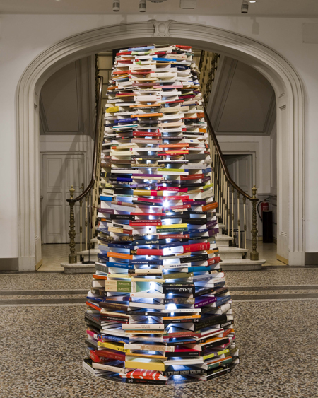 Una vez en el interior, atravesamos el hall donde encontramos Acumulador, una torre compuesta de libros iluminados, para llegar a Las palabras son demasiado concretas, una biblioteca con algunos libros cuyos títulos están compuestos por imágenes.