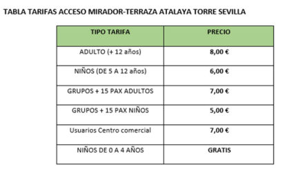 El acceso al mirador Atalaya Torre Sevilla tendrá un coste asociado que variará en función de las franjas de edad y número de visitantes, además de brindar tarifas preferenciales para los sevillanos. Asimismo, la gestión del flujo de visitantes se realizará siempre en el hall de acceso situado en la Planta Plaza del Centro Comercial TORRE SEVILLA, recientemente acondicionado y nunca a través del hotel.