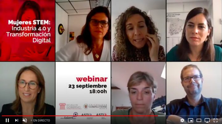 El webinar “Mujeres STEM: Industria 4.0 y Transformación Digital” forma parte de una serie de encuentros que han organizado conjuntamente la Fundación ASTI y la Escuela de Gobierno de la UCM coincidiendo con el lanzamiento del programa Máster en Desarrollo Directivo para Mujeres STEM, que dirige Silvia Carrascal, también moderadora de este debate.