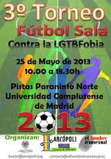 Un año más, la asociación universitaria LGTB Arcópoli y la asociación El Hombre Transexual- HT, junto con la colaboración de la Universidad Complutense de Madrid, han organizado el Tercer Torneo de Fútbol Sala contra la LGTBfobia y la discriminación en el deporte que tendrá lugar el próximo sábado 25 de mayo, desde las 9:45 horas, en las instalaciones deportivas del Paraninfo de la Universidad Complutense de Madrid.