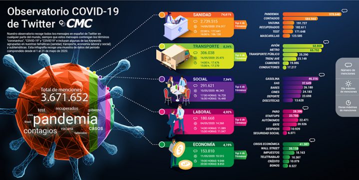 El Observatorio ofrece información relevante e incluye informes y gráficos interactivos a partir de la monitorización y escucha digital de todos los mensajes en español publicados en Twitter desde cualquier parte del mundo, siempre que contengan los términos “coronavirus”, “COVID-19” y “COVID19” e incorporen algunas de las palabras clave definidas por Grupo CMC. Los datos de este tercer informe reflejan que, una vez superada la fase de emergencia sanitaria, el foco informativo y la conversación social se han redirigido hacia cuestiones relacionadas con el transporte, propias del progresivo retorno a la actividad, así como hacia temas sociales y de índole económica y laboral.