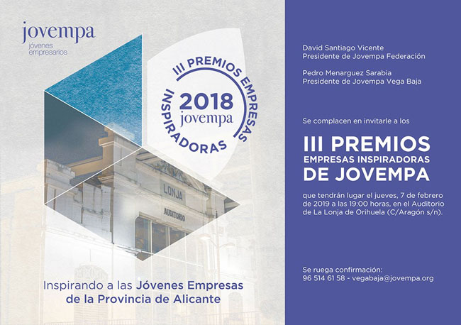 En el Auditorio de La Lonja de Orihuela (C/Aragón, s/n) de Alicante, a partir de las 19:00 horas del jueves 7 de febrero, tendrá lugar la entrega de los III Premios Empresas Inspiradoras de Jovempa, que van a reconocer a siete empresas de la provincia de Alicante, asociadas a cada una de las siete asociaciones comarcales. Estas empresas han destacado por su implicación con la asociación, su trayectoria y por haberse convertido en fuente de inspiración para el resto de jóvenes empresas de nuestra provincia.