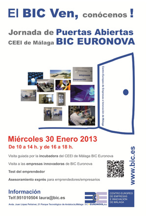 El Centro Europeo de Empresas e Innovación (CEEI) de Málaga BIC Euronova celebrará una jornada de puertas abiertas el próximo miércoles 30 de enero, con el fin de acercar sus servicios como incubadora pionera de Málaga con más de 20 años de experiencia, así como mostrar la actividad de las empresas innovadoras de su centro.