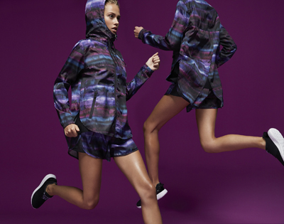Leggins, tops deportivos ajustados y también con tiras cruzadas, shorts y chaquetas ultraligeras que se adaptan a cualquier movimiento y situación. Diseños que incorporan detalles reflectantes aumentando la funcionalidad de las prendas siendo así aptas para la práctica deportiva más urbana. Todo en una combinación de colores fríos y en una amplia paleta de tonos lilas y azules, combinadas con el total black y el estampado tie dye que se inspira en el movimiento producido cuando cae la noche en la ciudad y en los destellos de la luz que iluminan a la deportista en cada paso.