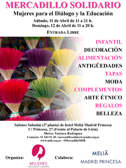 Los fondos recaudados en la cuarta edición del mercadillo solidario servirán para poner en marcha el punto de encuentro de MDE en la calle Gaztambide, que atenderá a las mujeres vulnerables mayores de 45 años. Este encuentro tendrá lugar el sábado, 11 de abril (de 11 h. a 21 h.), y el domingo 12 de abril (de 11 A 20 h), en Salones SABATINI del hotel Meliá Madrid Princesa.