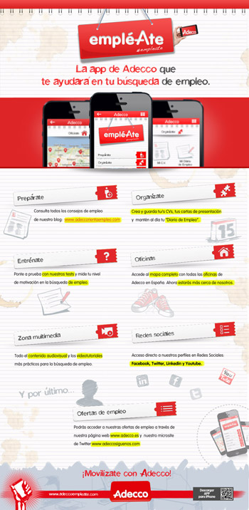 EmpléAte es la primera aplicación en España que orienta al candidato en su búsqueda de trabajo y le ofrece herramientas para convertir esta tarea en un proceso más sencillo. La aplicación, de carácter gratuito, se puede descargar en www.adeccoempleate.com a través de un código bidi o QR, está disponible en App Store y próximamente lo estará en Android Market.