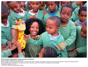 jirafa que hizo con un calcetín y que se ha convertido en la estrella de ‘A Tsehai le encanta aprender’, el programa infantil más popular de la televisión etíope. Se emite semanalmente en la televisión nacional y tiene una audiencia de aproximadamente 5 millones de niños. La compañía de Bruktawit, Whiz Kids Workshop, produce programas de televisión y radio e imprime libros para ayudar a millones de niños y adolescentes a mejorar su salud y su vida, además de combatir el analfabetismo en un país donde 300.000 menores de cinco años mueren anualmente, muchos por malnutrición o enfermedades curables.