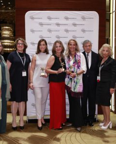 Las empresarias María Helena Antolín (Grupo Antolin), Rocío Hervella (Prosol) y Montse Martí (Martí Derm), premios IWEC 2018