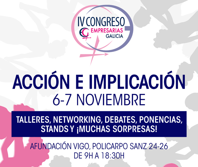 El Foro de la Mujer cederá su protagonismo el 7 de noviembre al resto de actividades programadas en el IV Congreso Empresarias Galicia. La Sede AFundación volverá a ser testigo de un evento que se ha convertido en la referencia en Galicia para la mujer empresaria, emprendedora, directiva, estudiante, autónoma… Se llevarán a cabo ponencias, una comida-networking y talleres. Además, habrá espacio para la exposición de los stands de las empresas e instituciones asociadas en los que darán a conocer sus productos y servicios.