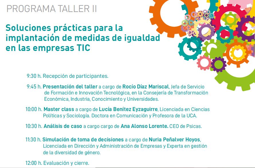 El próximo taller ‘Soluciones prácticas para la implantación de medidas de igualdad en las empresas TIC’, que tendrá lugar el día 20 de abril de 9:30 a 12:45 h., estará protagonizado por Ana Alonso, Rocío Díaz, Lucía Benítez y Nuria Peñalver Hoyos.